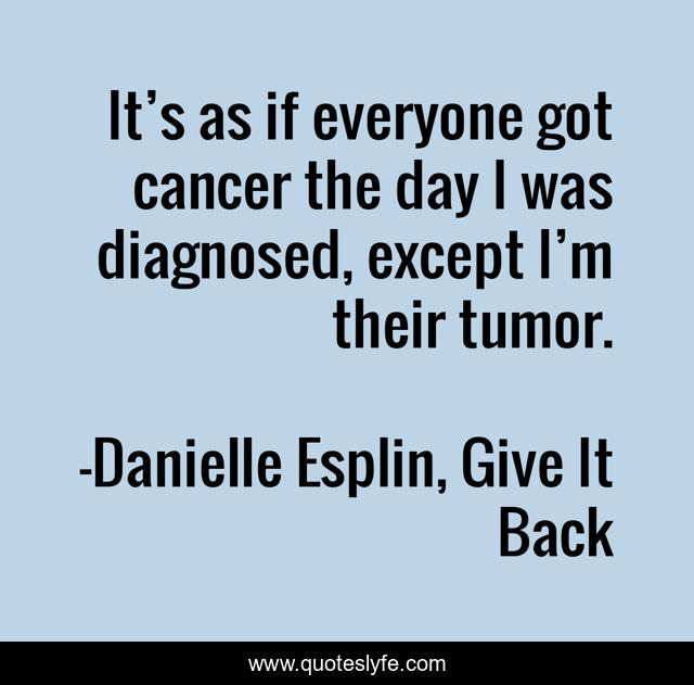This page presents the quote "It’s as if everyone got cancer the day I was diagnosed, except I’m their tumor.". Author of this quote is Danielle Esplin, Give It Back. This quote is about tumor, tumour, burden, brain-cancer, cancer,.