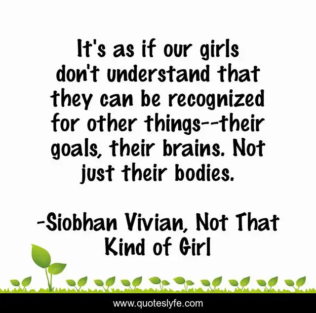 This page presents the quote "It's as if our girls don't understand that they can be recognized for other things--their goals, their brains. Not just their bodies.". Author of this quote is Siobhan Vivian, Not That Kind of Girl. This quote is about brains, feminist, goals, feminism, inspiration,.