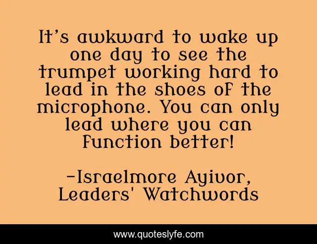 This page presents the quote "It’s awkward to wake up one day to see the trumpet working hard to lead in the shoes of the microphone. You can only lead where you can function better!". Author of this quote is Israelmore Ayivor, Leaders' Watchwords. This quote is about function, food-for-thought, misplaced-things, hard-work, awkward, work-hard, microphone, misplacement, work,.