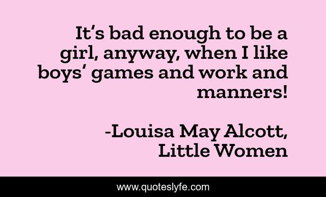 This page presents the quote "It’s bad enough to be a girl, anyway, when I like boys’ games and work and manners!". Author of this quote is Louisa May Alcott, Little Women. This quote is about boys, girl, work, games, manners,.