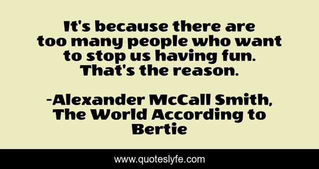This page presents the quote "It's because there are too many people who want to stop us having fun. That's the reason.". Author of this quote is Alexander McCall Smith, The World According to Bertie. This quote is about anthropology, culture, fun, fun-not-banned-yet,.