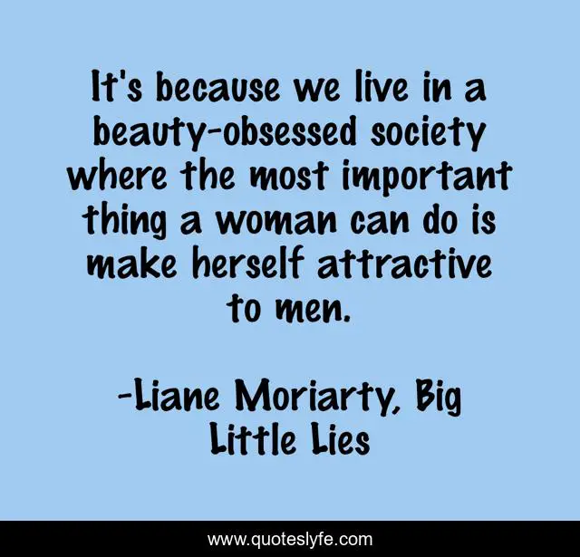 This page presents the quote "It's because we live in a beauty-obsessed society where the most important thing a woman can do is make herself attractive to men.". Author of this quote is Liane Moriarty, Big Little Lies. This quote is about life, love, family, society, secret, single-mom, friendship, affection,.