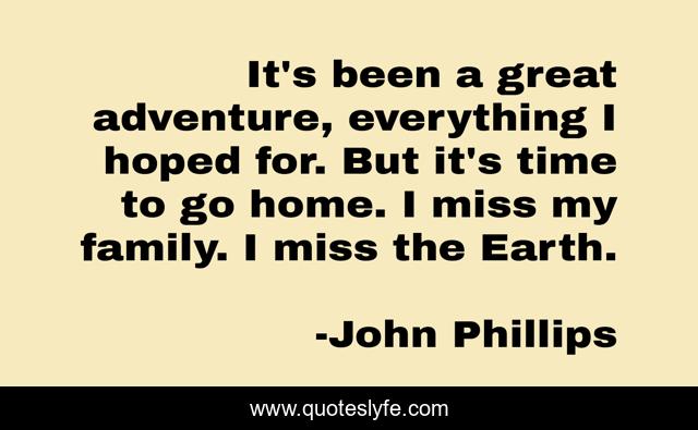 This page presents the quote "It's been a great adventure, everything I hoped for. But it's time to go home. I miss my family. I miss the Earth.". Author of this quote is John Phillips. This quote is about home, adventure, time,.