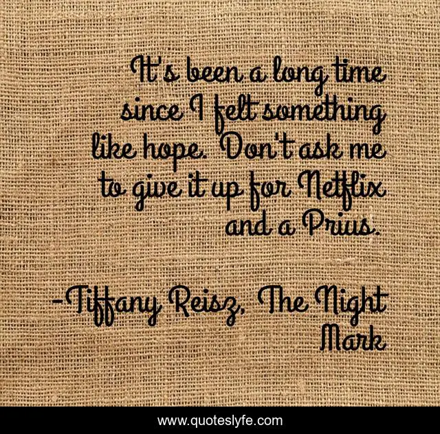 This page presents the quote "It's been a long time since I felt something like hope. Don't ask me to give it up for Netflix and a Prius.". Author of this quote is Tiffany Reisz, The Night Mark. .