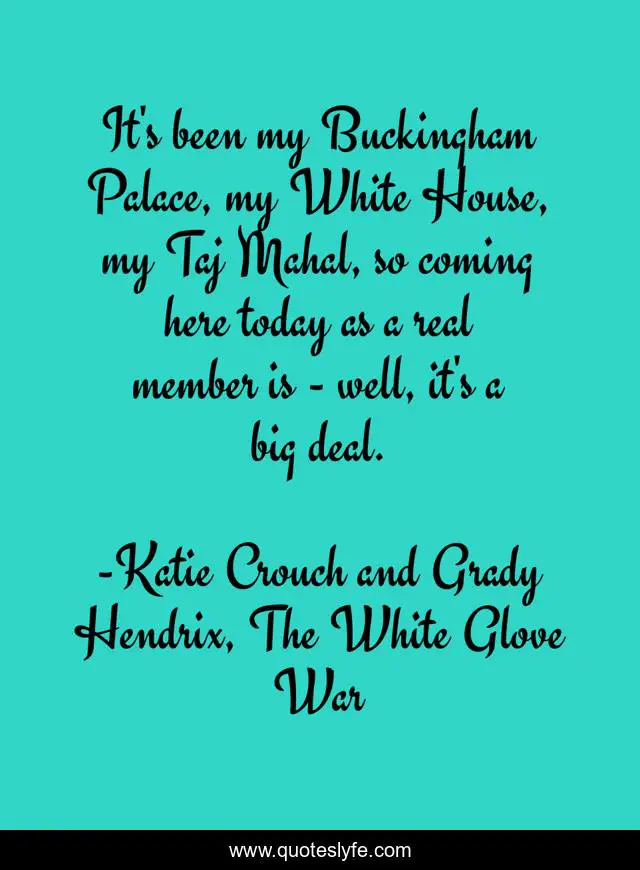 This page presents the quote "It's been my Buckingham Palace, my White House, my Taj Mahal, so coming here today as a real member is - well, it's a big deal.". Author of this quote is Katie Crouch and Grady Hendrix, The White Glove War. This quote is about romance, magic, suspense, darkness,.