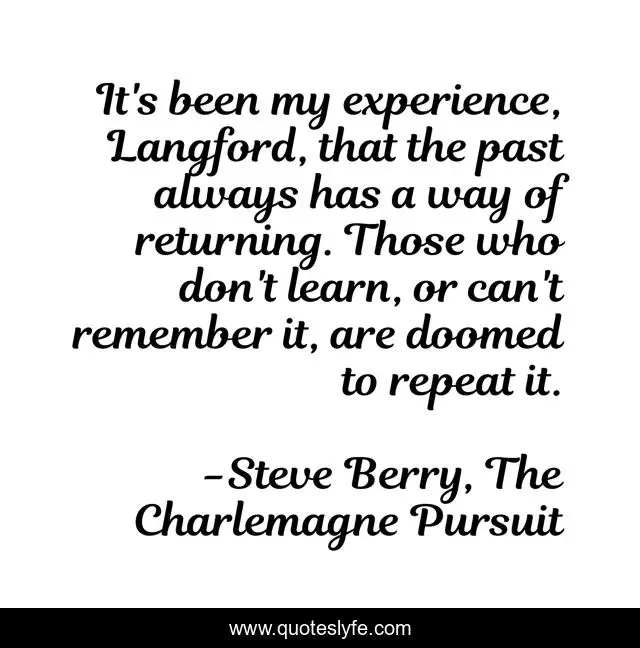 This page presents the quote "It's been my experience, Langford, that the past always has a way of returning. Those who don't learn, or can't remember it, are doomed to repeat it.". Author of this quote is Steve Berry, The Charlemagne Pursuit. This quote is about past, doomed-to-repeat-it, history,.