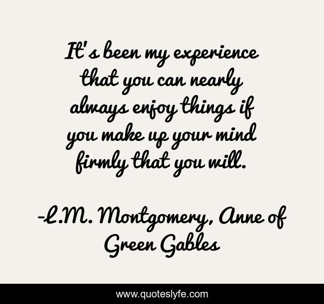 This page presents the quote "It's been my experience that you can nearly always enjoy things if you make up your mind firmly that you will.". Author of this quote is L.M. Montgomery, Anne of Green Gables. .