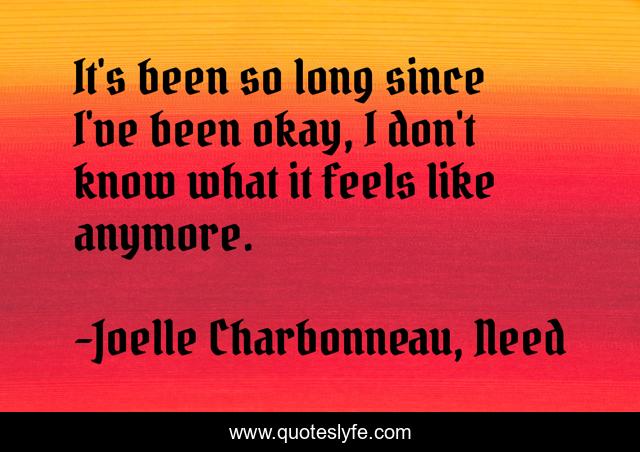 This page presents the quote "It's been so long since I've been okay, I don't know what it feels like anymore.". Author of this quote is Joelle Charbonneau, Need. This quote is about need, joelle-charbonneau,.