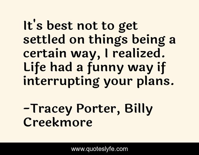 This page presents the quote "It's best not to get settled on things being a certain way, I realized. Life had a funny way if interrupting your plans.". Author of this quote is Tracey Porter, Billy Creekmore. This quote is about billy, creekmore, life, fiction,.