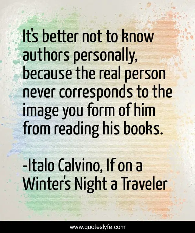 This page presents the quote "It's better not to know authors personally, because the real person never corresponds to the image you form of him from reading his books.". Author of this quote is Italo Calvino, If on a Winter's Night a Traveler. This quote is about truth, authors,.