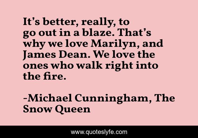 This page presents the quote "It’s better, really, to go out in a blaze. That’s why we love Marilyn, and James Dean. We love the ones who walk right into the fire.". Author of this quote is Michael Cunningham, The Snow Queen. This quote is about fire, blaze,.