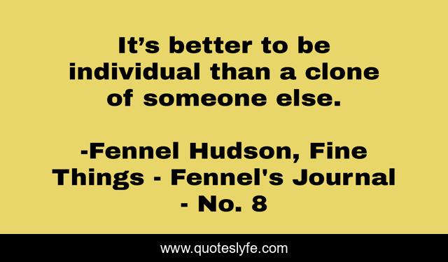 This page presents the quote "It’s better to be individual than a clone of someone else.". Author of this quote is Fennel Hudson, Fine Things - Fennel's Journal - No. 8. This quote is about individuality, clone, character, uniqueness, individual, copy,.