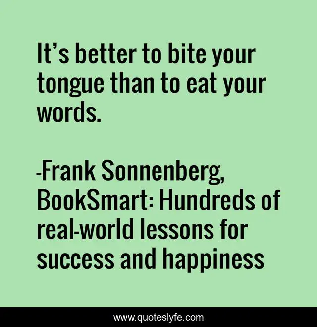 This page presents the quote "It’s better to bite your tongue than to eat your words.". Author of this quote is Frank Sonnenberg, BookSmart: Hundreds of real-world lessons for success and happiness. This quote is about relationships, communication,.