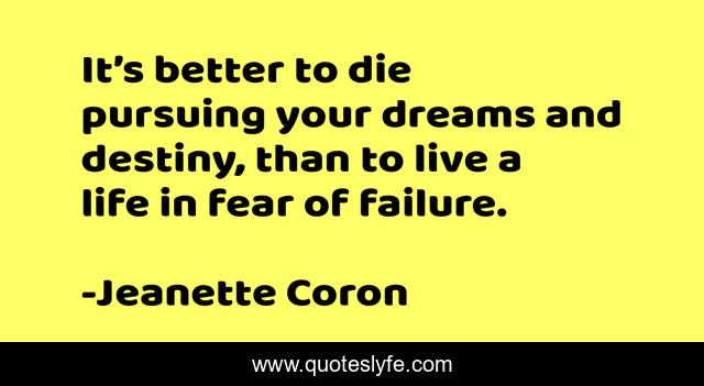 This page presents the quote "It’s better to die pursuing your dreams and destiny, than to live a life in fear of failure.". Author of this quote is Jeanette Coron. This quote is about pursuing-your-destiny, destiny, success,.