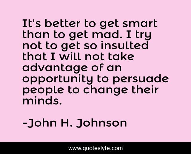 This page presents the quote "It's better to get smart than to get mad. I try not to get so insulted that I will not take advantage of an opportunity to persuade people to change their minds.". Author of this quote is John H. Johnson. This quote is about opportunity, smart, people,.