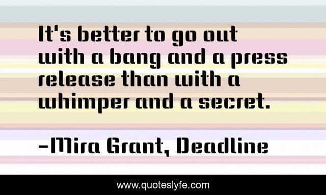 This page presents the quote "It's better to go out with a bang and a press release than with a whimper and a secret.". Author of this quote is Mira Grant, Deadline. .