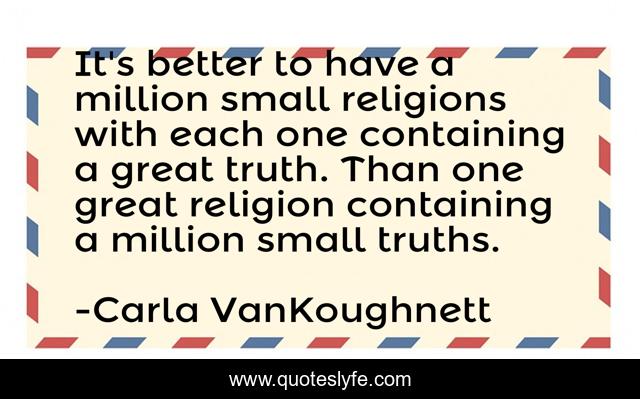 This page presents the quote "It's better to have a million small religions with each one containing a great truth. Than one great religion containing a million small truths.". Author of this quote is Carla VanKoughnett. This quote is about religion, philosophy,.