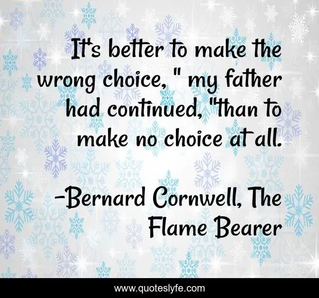 This page presents the quote "It's better to make the wrong choice, " my father had continued, "than to make no choice at all.". Author of this quote is Bernard Cornwell, The Flame Bearer. This quote is about better, make, father, wrong, choice,.