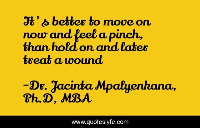 This page presents the quote "It's better to move on now and feel a pinch, than hold on and later treat a wound". Author of this quote is Dr. Jacinta Mpalyenkana, Ph.D, MBA. This quote is about enthusiasm, courage, move-on, drive, inspirational,.