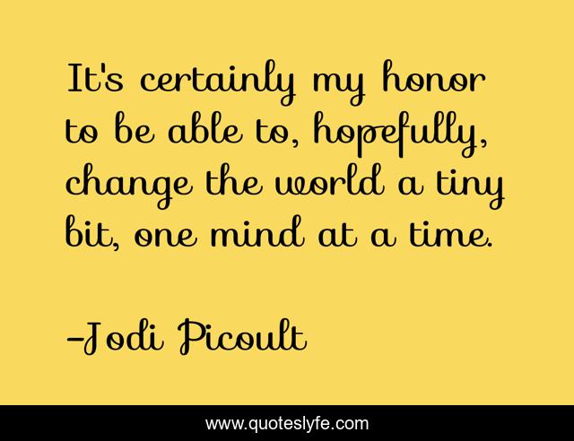 This page presents the quote "It's certainly my honor to be able to, hopefully, change the world a tiny bit, one mind at a time.". Author of this quote is Jodi Picoult. This quote is about change the world, time,.