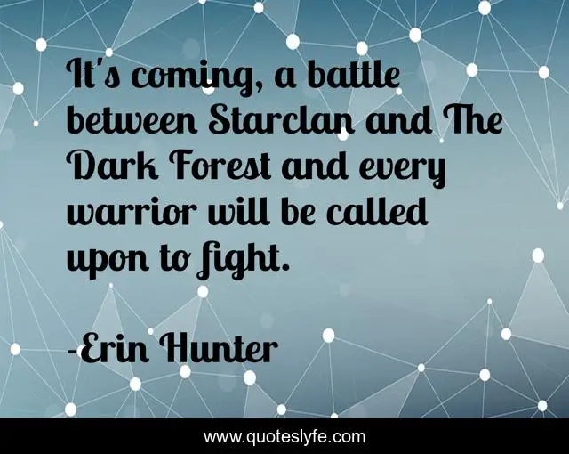 This page presents the quote "It's coming, a battle between Starclan and The Dark Forest and every warrior will be called upon to fight.". Author of this quote is Erin Hunter. This quote is about warriors, choices, jayfeather, starclan, dark-forest,.