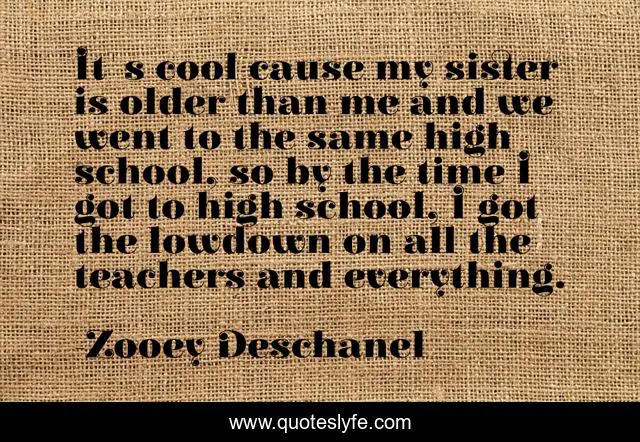This page presents the quote "It's cool cause my sister is older than me and we went to the same high school, so by the time I got to high school, I got the lowdown on all the teachers and everything.". Author of this quote is Zooey Deschanel. This quote is about sister, school, time,.