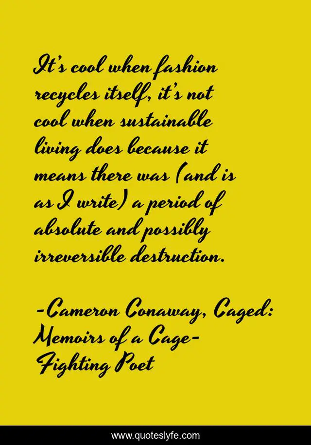 This page presents the quote "It’s cool when fashion recycles itself, it’s not cool when sustainable living does because it means there was (and is as I write) a period of absolute and possibly irreversible destruction.". Author of this quote is Cameron Conaway, Caged: Memoirs of a Cage-Fighting Poet. This quote is about fashion, nature, environment, religion, rational, sustainable, cool,.
