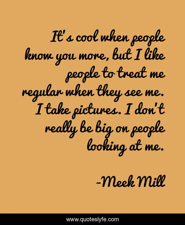 This page presents the quote "It's cool when people know you more, but I like people to treat me regular when they see me. I take pictures. I don't really be big on people looking at me.". Author of this quote is Meek Mill. This quote is about me, treat, people,.