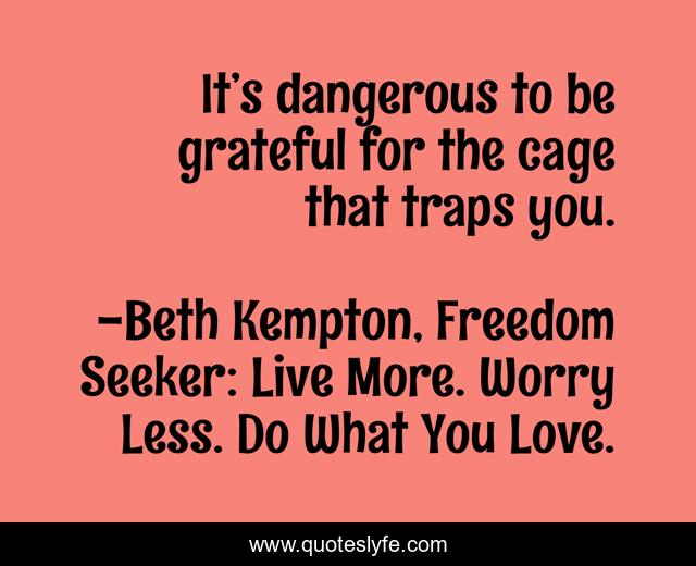 This page presents the quote "It’s dangerous to be grateful for the cage that traps you.". Author of this quote is Beth Kempton, Freedom Seeker: Live More. Worry Less. Do What You Love.. This quote is about freedom-of-choice, life, inspirational, personal-growth, freedom, travel, motivational, confidence, inspirational-life,.