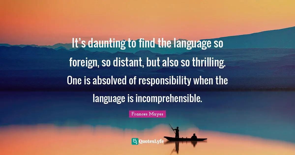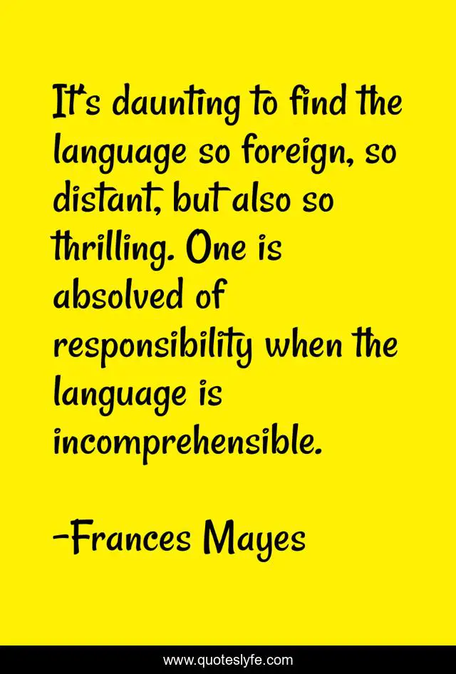 This page presents the quote "It’s daunting to find the language so foreign, so distant, but also so thrilling. One is absolved of responsibility when the language is incomprehensible.". Author of this quote is Frances Mayes. This quote is about travel, travel-writing,.