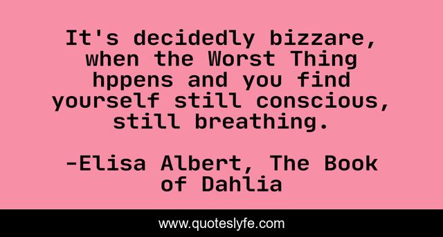 This page presents the quote "It's decidedly bizzare, when the Worst Thing hppens and you find yourself still conscious, still breathing.". Author of this quote is Elisa Albert, The Book of Dahlia. This quote is about living, breathing, bad-things-happen,.