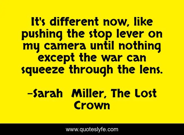 This page presents the quote "It's different now, like pushing the stop lever on my camera until nothing except the war can squeeze through the lens.". Author of this quote is Sarah Miller, The Lost Crown. This quote is about romanovs, russian-revolution, russia, anastasia, tsar-nicholas, otma, war,.