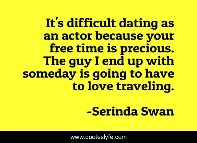 This page presents the quote "It's difficult dating as an actor because your free time is precious. The guy I end up with someday is going to have to love traveling.". Author of this quote is Serinda Swan. This quote is about love, end, affection, time,.