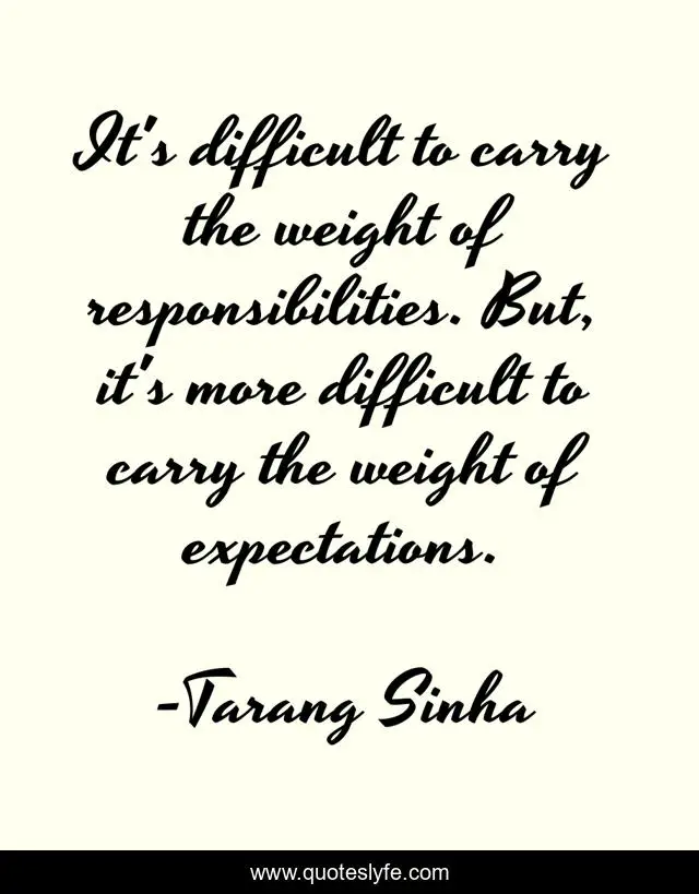 This page presents the quote "It's difficult to carry the weight of responsibilities. But, it's more difficult to carry the weight of expectations.". Author of this quote is Tarang Sinha. This quote is about life, life-and-living,.