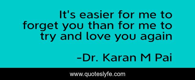 This page presents the quote "It's easier for me to forget you than for me to try and love you again". Author of this quote is Dr. Karan M Pai. This quote is about sad-but-true, men-and-women, break-up, bonding-the-unholy-love-matrix, love-story, life-and-living,.