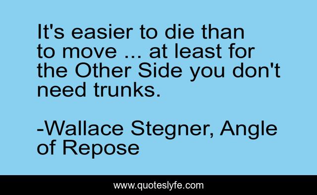 This page presents the quote "It's easier to die than to move ... at least for the Other Side you don't need trunks.". Author of this quote is Wallace Stegner, Angle of Repose. This quote is about baggage, death, moving,.