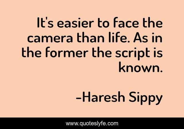 This page presents the quote "It's easier to face the camera than life. As in the former the script is known.". Author of this quote is Haresh Sippy. This quote is about life, camera, camera-lens, life-lessons, script,.