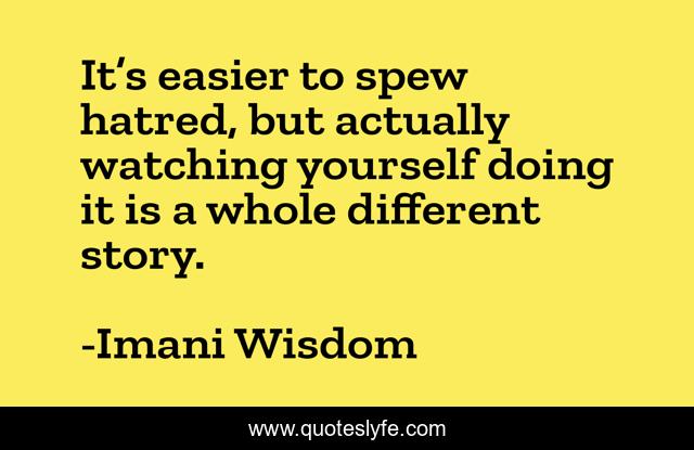 This page presents the quote "It’s easier to spew hatred, but actually watching yourself doing it is a whole different story.". Author of this quote is Imani Wisdom. This quote is about romance-love, family-saga, suspense, inspirational, enthusiasm,.