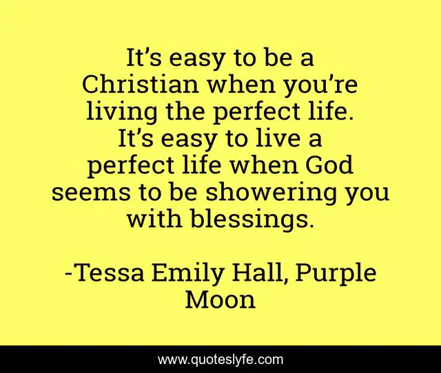This page presents the quote "It’s easy to be a Christian when you’re living the perfect life. It’s easy to live a perfect life when God seems to be showering you with blessings.". Author of this quote is Tessa Emily Hall, Purple Moon. This quote is about inspirational-life, enthusiasm, inspirational,.