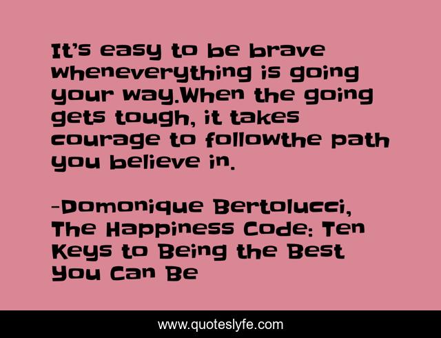 This page presents the quote "It’s easy to be brave wheneverything is going your way.When the going gets tough, it takes courage to followthe path you believe in.". Author of this quote is Domonique Bertolucci, The Happiness Code: Ten Keys to Being the Best You Can Be. This quote is about life-coaching, motivation, how-to-be-happier, life-coach, be-happy, how-to-be-happy, happiness-advice, happiness, be-more-motivated,.