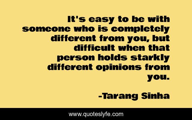This page presents the quote "It's easy to be with someone who is completely different from you, but difficult when that person holds starkly different opinions from you.". Author of this quote is Tarang Sinha. .