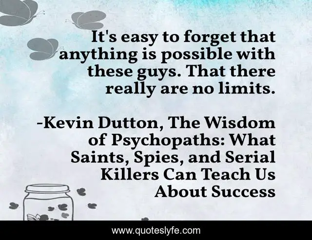 This page presents the quote "It's easy to forget that anything is possible with these guys. That there really are no limits.". Author of this quote is Kevin Dutton, The Wisdom of Psychopaths: What Saints, Spies, and Serial Killers Can Teach Us About Success. This quote is about possible, limits,.