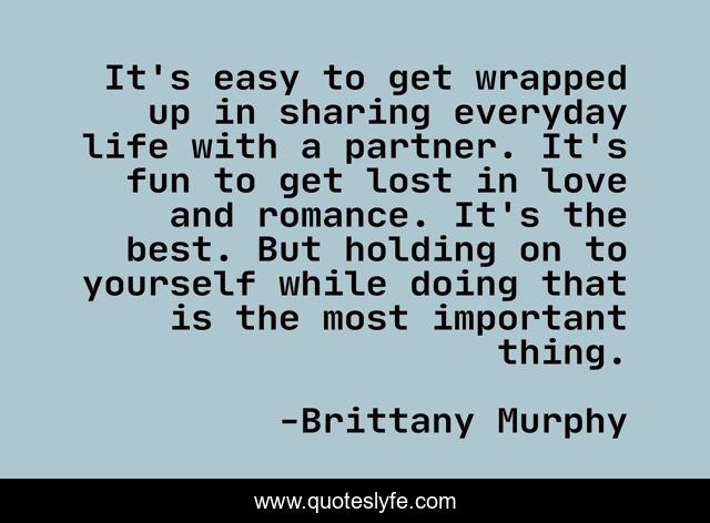 This page presents the quote "It's easy to get wrapped up in sharing everyday life with a partner. It's fun to get lost in love and romance. It's the best. But holding on to yourself while doing that is the most important thing.". Author of this quote is Brittany Murphy. This quote is about life, love, best, affection,.
