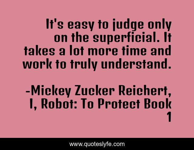 This page presents the quote "It's easy to judge only on the superficial. It takes a lot more time and work to truly understand.". Author of this quote is Mickey Zucker Reichert, I, Robot: To Protect Book 1. This quote is about superficiality, diligence, integrity, understanding,.