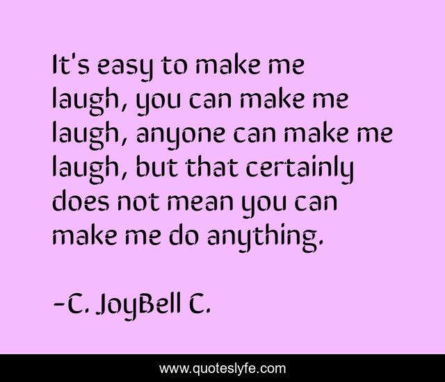 This page presents the quote "It's easy to make me laugh, you can make me laugh, anyone can make me laugh, but that certainly does not mean you can make me do anything.". Author of this quote is C. JoyBell C.. This quote is about make-me-laugh, laughter, women, quotes-for-women, womens-inspirational,.