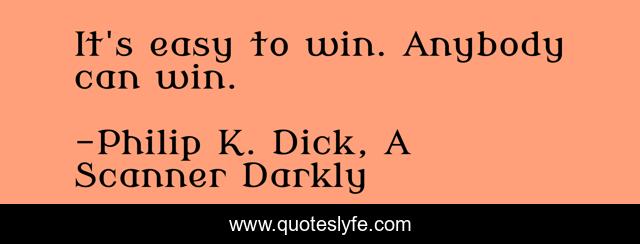 This page presents the quote "It's easy to win. Anybody can win.". Author of this quote is Philip K. Dick, A Scanner Darkly. This quote is about life-and-living, donna-hawthorne, loser, winning,.