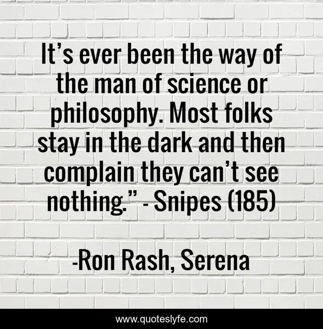 This page presents the quote "It’s ever been the way of the man of science or philosophy. Most folks stay in the dark and then complain they can’t see nothing.” – Snipes (185)". Author of this quote is Ron Rash, Serena. This quote is about darkness, science, philosophy, ignorance, sight, enlightenment,.