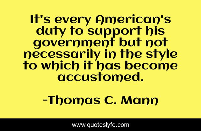 This page presents the quote "It's every American's duty to support his government but not necessarily in the style to which it has become accustomed.". Author of this quote is Thomas C. Mann. .