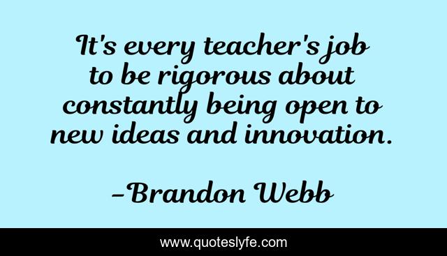 This page presents the quote "It's every teacher's job to be rigorous about constantly being open to new ideas and innovation.". Author of this quote is Brandon Webb. This quote is about job, ideas, innovation,.
