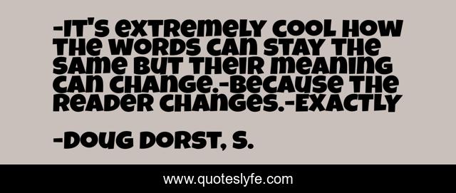 This page presents the quote "-It's extremely cool how the words can stay the same but their meaning can change.-Because the reader changes.-EXACTLY". Author of this quote is Doug Dorst, S.. .